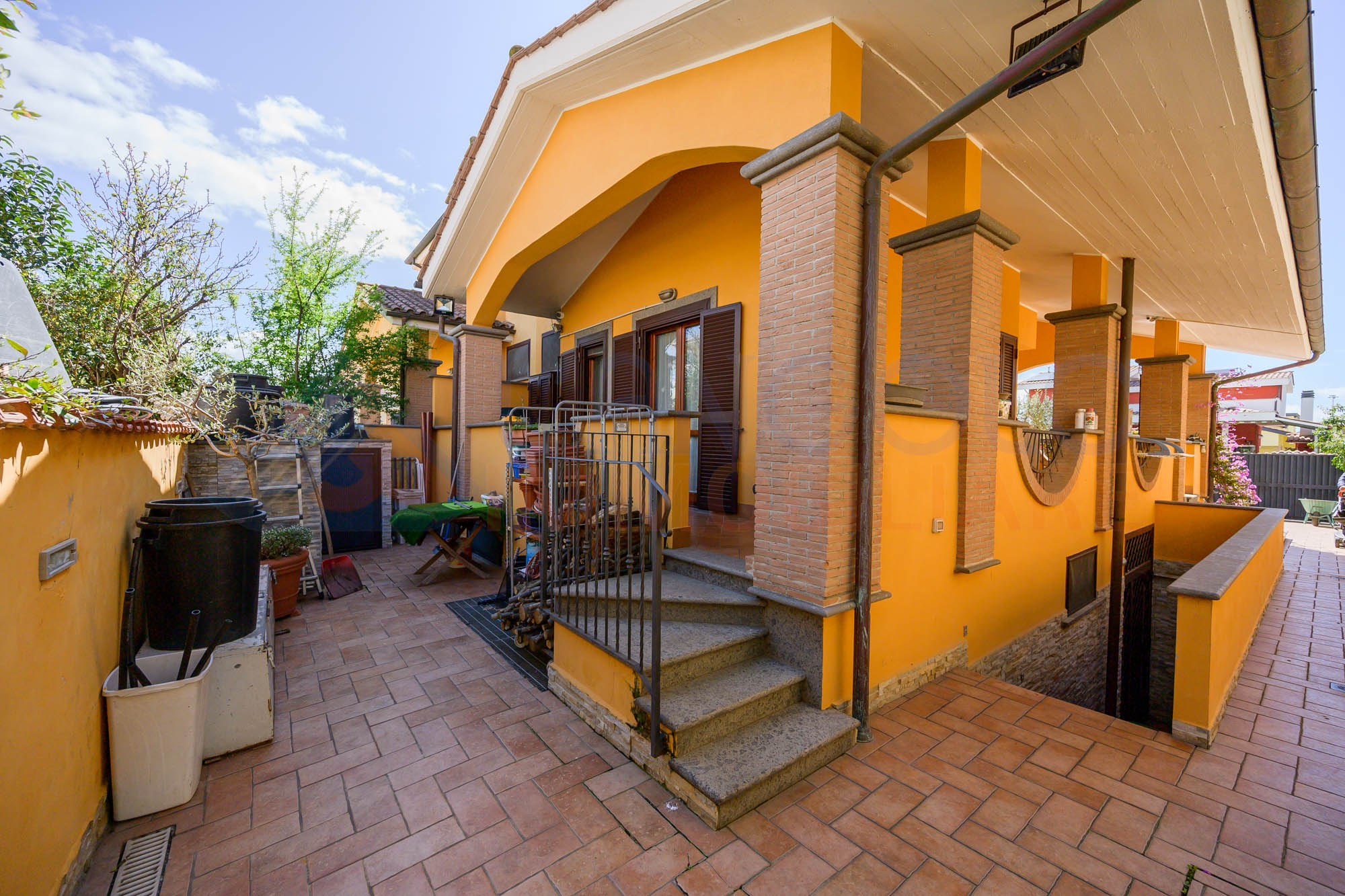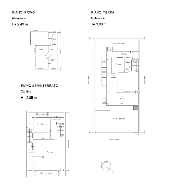 Al pian terreno l’abitazione è composta da un comodo soggiorno, una cucina (attualmente adoperata a studio, ma con tutti gli attacchi previsti per l’uso), un bagno di servizio, portico perimetrale e giardino perimetrale con possibilità di parcheggio all’interno.